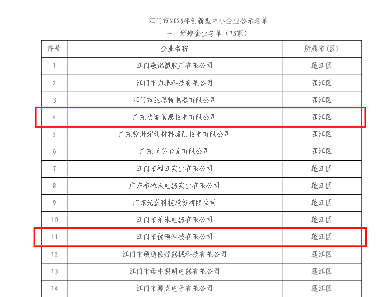近日,广东省工业和信息化厅发布了《2025年广东省创新型中小企业名单》,在广东省科学院江门产业技术研究院(简称“江门产研院”)的辅导下,江门市火炬高新技术创业园入孵企业广东明道信息技术有限公司、江门市优领科技有限公司成功通过认定,广东鲜美种苗股份有限公司顺利通过复核认定。